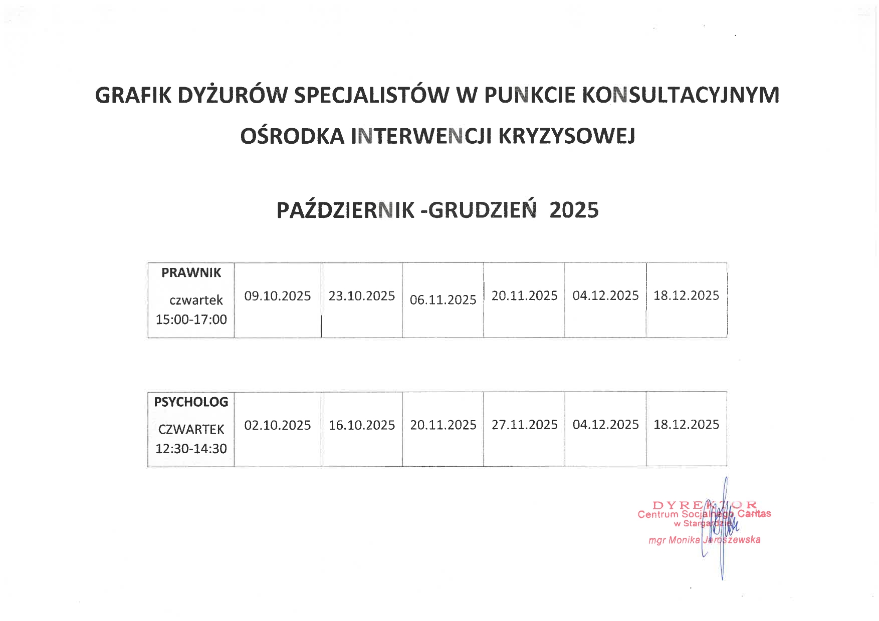 Prawnik i psycholog będą pełnili dyżury według załączonego harmonogramu (tel. 91-578-08-30)